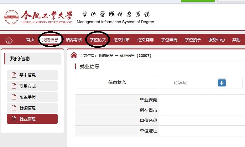 5、填写内容包括:“我的信息”与“学位论文”两个栏目(如下图所示)。其中“我的信息”栏目需填写“基本信息”、“联系方式”、“前置学历”、“就读信息”及“就业信息”五项。学位论文栏目填写“学位论文信息“一项即可。