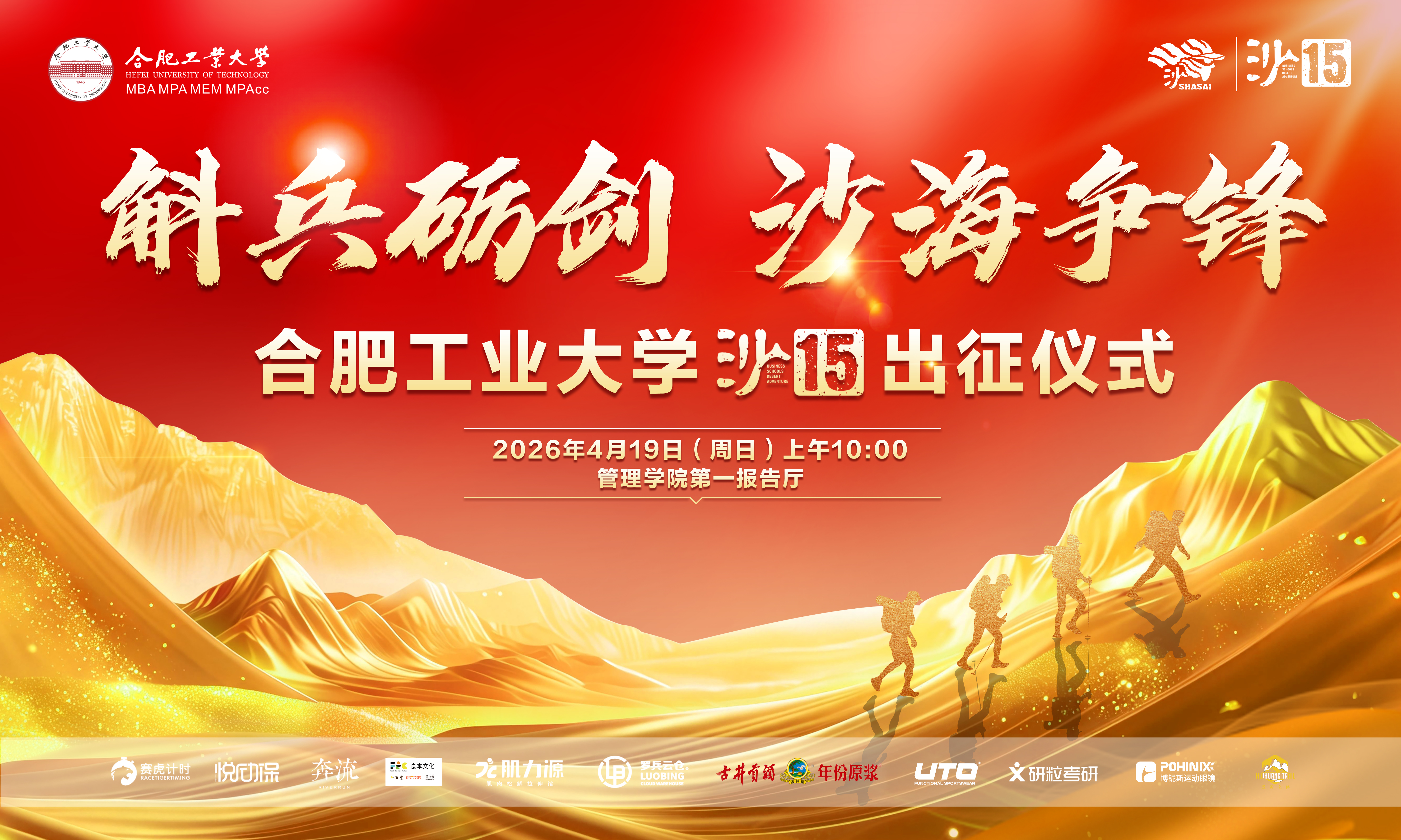 4月19日,合肥工业大学第十五届商学院沙漠挑战赛(沙15)出征仪式在屯溪路校区顺利举行。合肥工业大学MBA MPA管理中心主任罗彪教授、带队老师陈梦琪,户外运动协会秘书长兼沙15领队李晓敏、副秘书长李伟光出席仪式。历届沙友、兄弟院校代表及沙15全体队员齐聚一堂,共启大漠征程。